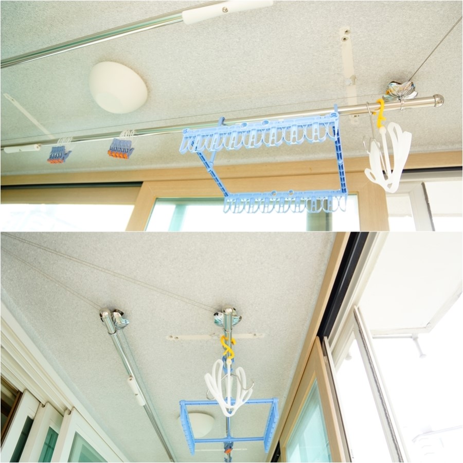 항상 빨래 할때는 옷걸이를 가져다 주는데, 기존의 천장빨래건조대는 높아서 스스로 할수가 없었는데요..